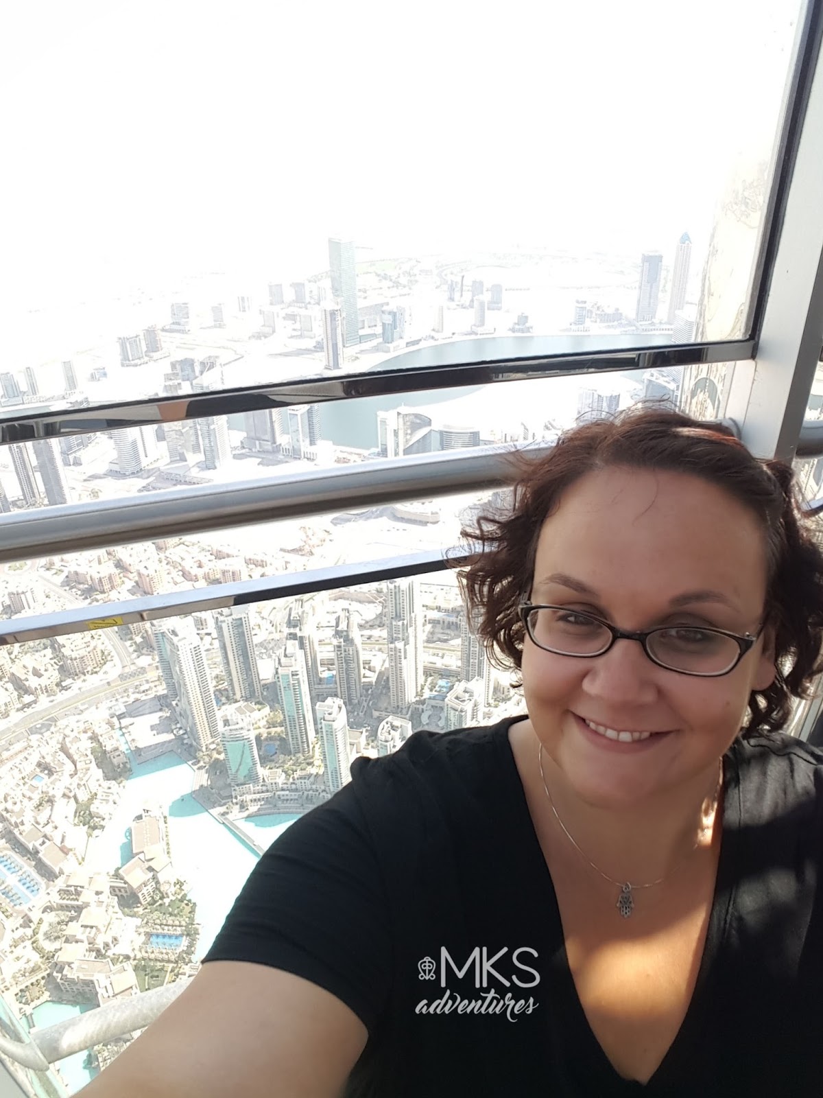 Then it was time for the big event! Amelia and I had bought our tickets ahead of time to go to the top of the Burj Khalifa, the 146th floor, which towers 555m above the ground and is the tallest observatory in the world. The elevators zip up at more than 9m per second, so in about 70 ear popping seconds you're at the lower observation deck (on floor 126). Then you board a separate elevator to go to the top.
